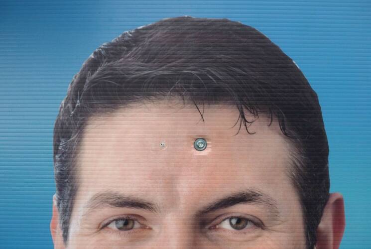 The Irish landscape was littered with electoral campaign advertising during the recent European, local and national by-elections. ‚Vote No. 1′ documents this and examines the culture of election advertising in Ireland. The series focuses on the accidental, and often gruesome, disfigurements the electoral candidates‘ faces suffer – an unintended consequence of their posters‘ erection. These images reflect the Irish electorate’s increasing disillusionment with the political process after years of harshening austerity politics.