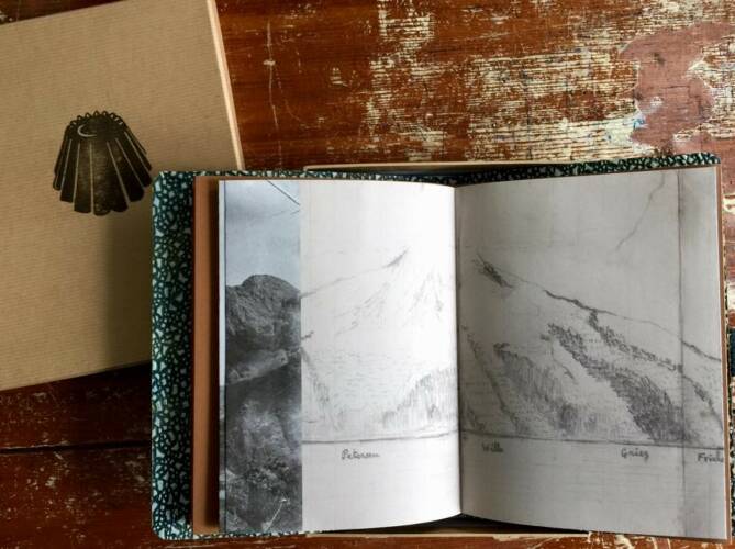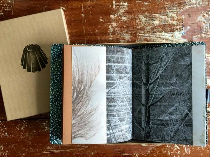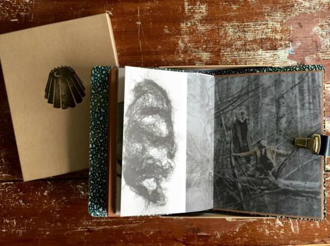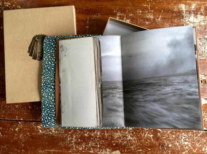 This limited edition book is printed on deadstock recycled inkjet paper and has been bound by hand, with an embossed black leather cover and buckle clasp. Inside the book a concertina fold contains a further eleven concertina folds. Edition of 100.