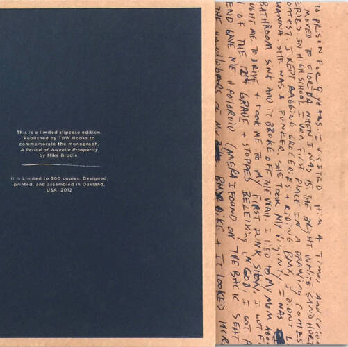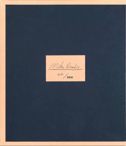 This signed first edition of the book comes encased in a screen printed dust jacket printed on 75 lb. butcher. The jacket design originates from Brodie's handwritten notes from the afterword of the book itself which Martin Parr and Gerry Badger have called "one of the best introductions ever written by a photographer."