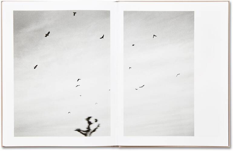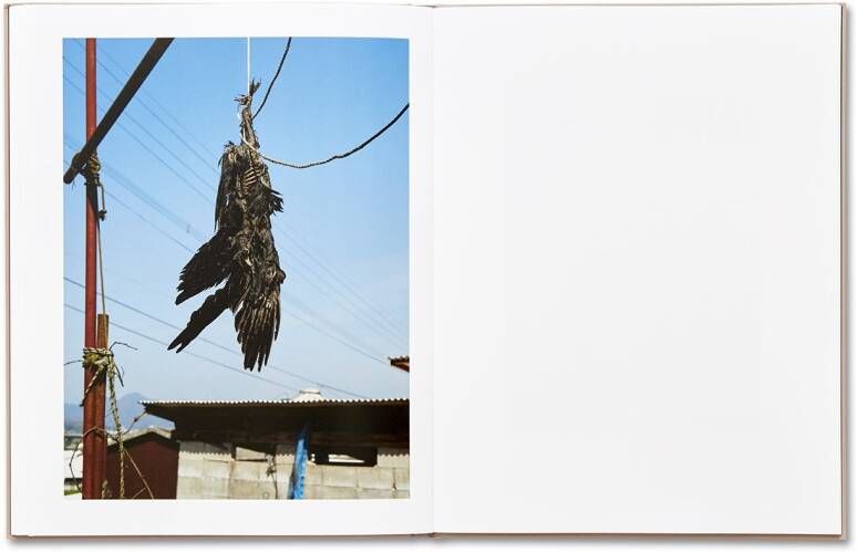 The genesis of Guillaume Simoneau’s new book, Murder, is in spring 1982. At around the same time Masahisa Fukase was producing his post-war masterpiece Karasu (Ravens), Simoneau’s family adopted a nest full of baby crows orphaned from a fallen tree. The photographs from this time, taken by Simoneau’s mother, paint an unusual and lyrical vision of childhood. Nearly forty years later, these moments are memorialised in dialogue with Simoneau’s new works, produced in the spring of 2016 and 2017 in Kanazawa, Japan. This setting, the birthplace of Karasu, punctuates the book with a further-reaching interest in tradition and timelessness that looks beyond the scope of these events to the landscape, famous thatched houses, the pine forests and coastline. The crisp, architectural qualities of the new photographs evoke a rendering of Fukase’s original that is, however, distinctly of its time. In Murder, the original black and white image of the photographer as a child, crows perched on his shoulders, is set alongside visions of violence: one crow hanging by rope, tangled and rotting, another pinned down by a large bird of prey. The mood of this contrast is never cynical: instead, it develops an ambivalent approach to nostalgia that is energetic and cathartic. Several of these photographs directly reference Karasu, and it is this language of violence inherited from Fukase that becomes the mode with which Simoneau challenges this inheritance.