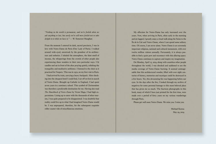 On Monday, April 15, 2019, along with countless other people throughout the world, I was shocked and saddened to see the media coverage of Notre-Dame burning. It seemed unimaginable that this architectural wonder, filled with over eight centuries of history, memories and mystique could be destroyed in a few hours. Yet, this devastating fire was happening before our eyes. In the days after the fire, I looked through my archive of negatives for some personal homage to this most beloved place that has given me so much. The fourteen photographs in this book, many of which I have just printed for the first time, were made over a period of forty years on my various wanderings through Paris.