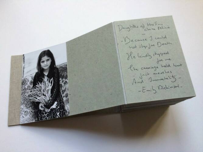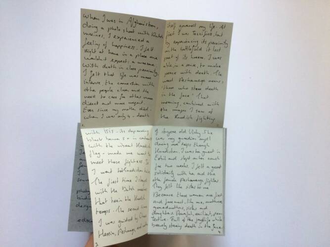 Claire Felicie, a photographer based in Amsterdam, visited Iraqi Kurdistan twice: in 2017 and 2018. This handmade leporello gives an impression of these journeys and her encounters with female Peshmerga fighters. She shot the portraits and landscapes on film and printed all postcard-size photos in her own darkroom. The outcome: this leporello with an additional handwritten letter, is a celebration of hand labor. An ode to analog photography in a digital age.