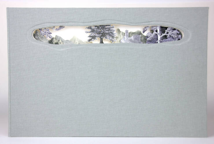 A book to lose yourself in… This blank-paged, hand-bound book in landscape format has an intricate, hand-cut design with picture elements attached in the upper part of the pages. The scene is cut into the pages of the book at different depths, creating a three-dimensional effect which changes as you leaf through the book. This three-dimensional design can even be seen when the book is closed, thanks to the innovative ‘window’ in the front cover.