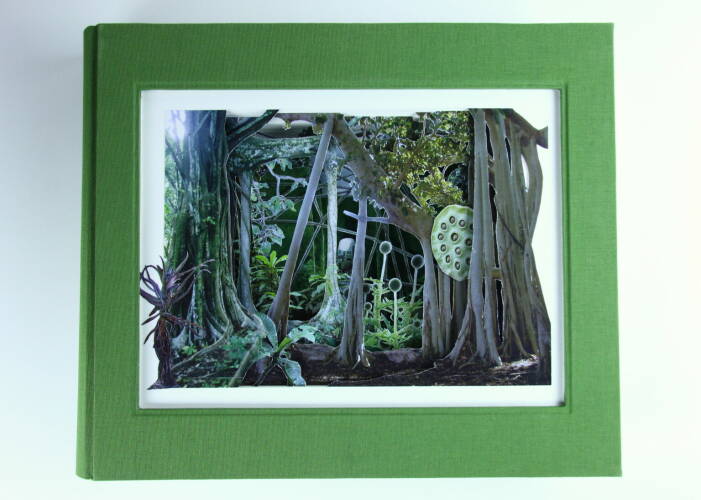 Comments: Handbound book with three-dimensional hand-cut collage based on own photography; 170 g/qm Gerstaecker paper, green bookbinding linen, hand-stitched headband, signed and stamped. The book measures 25cm x 30cm x 4,5cm when closed.