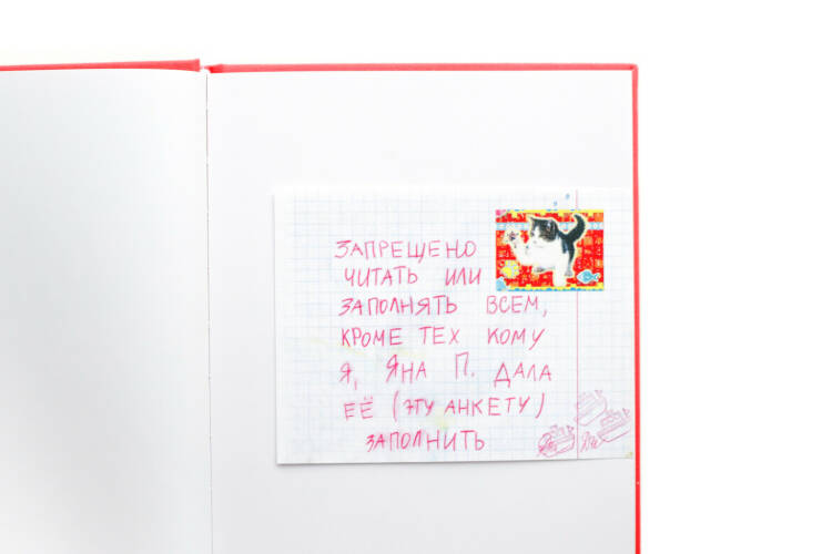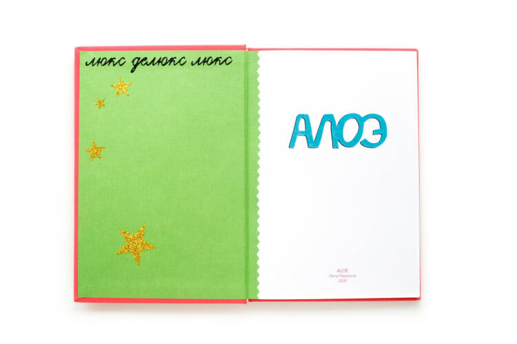 «Aloe» is a group of 21st Century Punk Intelligentsia fromSt. Petersburg, Russia - a new subculture community inspired by pop-cultureof the 90-sand 00-s. Yana Perovskaya founded Aloe 9 years ago. In the beginningit was a tiny second-hand store. Yet now Aloe has its own clothes brand, every occasion outfit rental, they release recycling collections, participate in charity initiatives, actively advocate for an ecological lifestyle and organise the famous Dikoe Disco party. Last gig were attended by 7-8 thousand people. The book cover was made from a fabric similar to that use for clothes tailoring. Unicorn patch on the cover is Aloe logo. Thermal sticker on the flyleaf is also used in clothes making. There are a lot of hand sticked inserts and stickers because the book was creating with an attention to detail as same as Aloe clothes and the party decor. At the end of the book you will find an envelope with postcards and stickers usually printed for giving away at the entrance of the parties. Questionnaire for friends made by Yana is the key to understanding the book. Answering the questions you can feel yourself as a part of the community, a friend. Also you can find some of my answers at the photos. Entire design of the book refers to school questionnaires