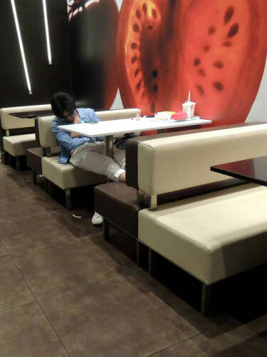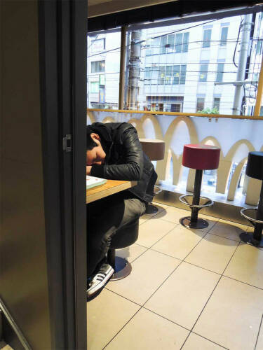 At three o’clock in the morning after singing in the karaoke bar, the subways in Tokyo are finished running. You are resigned to take a taxi, but as this is ridiculously expensive many Japanese have come up with an alternative. They go to the nearby Mc Donald’s. Instead of a meal, cups of soda or cheap coffee are being ordered. Everyone is seeking a comfortable place to take a nap until the first Metro starts up. For a week we got up at half past three in the morning to witness this phenomenon. The cities of the world are starting to look more and more alike – you can find the exact same stores and chains everywhere. What took us by surprise about this place is that a universal format such as McDonald’s can be temporarily transformed into a hotel.
