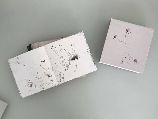 Comments: First edition of 300 signed and numbered copies including 20 collector's editions with a signed print. Size: 20 x 20 cm. Eight handbound booklets in a linen slipcase. More than 20 different papers have been used for this artist book. One of the booklets (Frost) is printed with silver on black paper.