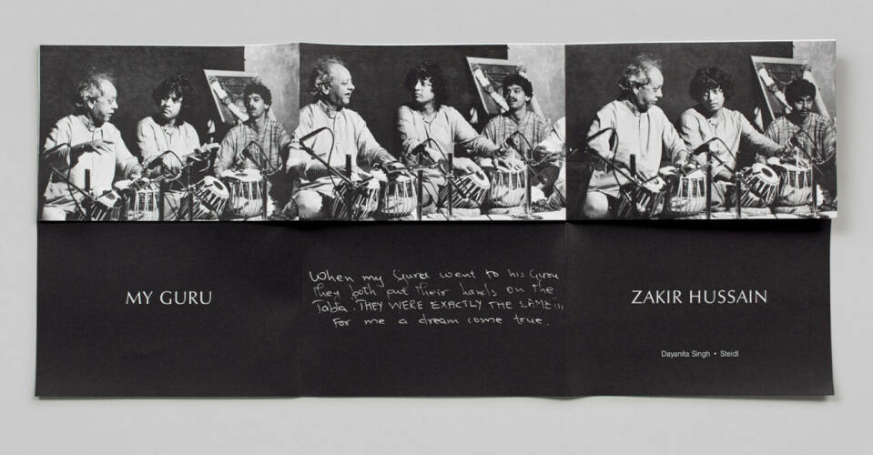 The book is well known as Dayanita Singh’s primary medium, one she explores to create new relationships between photography, publishing, the exhibition and the museum. But where did her passion for the book as the ideal vessel for her photos, for the stories she tells, begin? The answer lies in Zakir Hussain, a handmade maquette Singh crafted in 1986 as her first project as a graphic design student. The protagonist of Singh’s photo essay is the Indian classical tabla virtuoso Zakir Hussain, whom she captured on the stage and at home with his family. Surrounding the photos are handwritten texts gleaned from interviews Singh made with her sitters, including insights from Hussain: “I will always be a musician. A musician will always be a musician, not just me. He may stop performing but the musician is still there.”