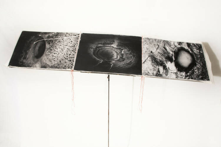 Unique handmade book made by the artist herself. There are 6 triptychs composed of 3 silver gelatin prints done by the artist on aquarelle paper, 37x53 cm each photograph. They are marouflée on cotton fabric and seaw with red threads. Each set mesures 40x 165 cm. The portfolio is done with cartoon and aluminum , on the cover is a silk screen print on a metal shape. The images of the Earth surface are dramatic , they look like some lonely , abandoned planet , mysterious light is suggesting that there is an unknown space around - It is a fascination by the beauty of a primer matter. The book can be placed on an iron structure similar to the tripod for the music partition /score/.