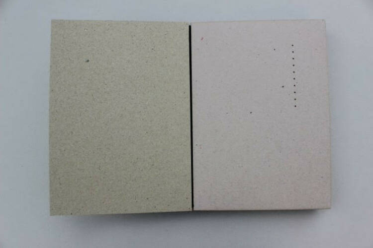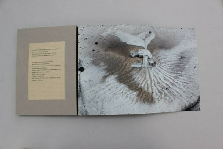 Gabriela's work is totally interwoven into the shape of the book where the straw cardboard responds to the old squared paper (where the text is printed), while the photos laminated on grey cardboard the outside of the pages. Architecture is at the epicentre of the structure and in the plaster creations integrated in the cut-out forms. If the book's framework evokes a sense of simplicity through the neutrality of a poor cardboard, the photographs printed on Japanese cotton paper bring a sober refinement to the whole. The last page of the book is clear and through a cut-out window (with a random shape), the colophon signed by the authors appears as an epilogue. Once the book has been read and explored (it requires some manipulation on the part of the reader), the mystery of the author's spiritual quest remains, in close concordance with the artist's interventions. This mystery, barely touched upon, impenetrable and complex, which we brush up against when opening this strange book, nevertheless remains with us for a long time once the last page is closed.