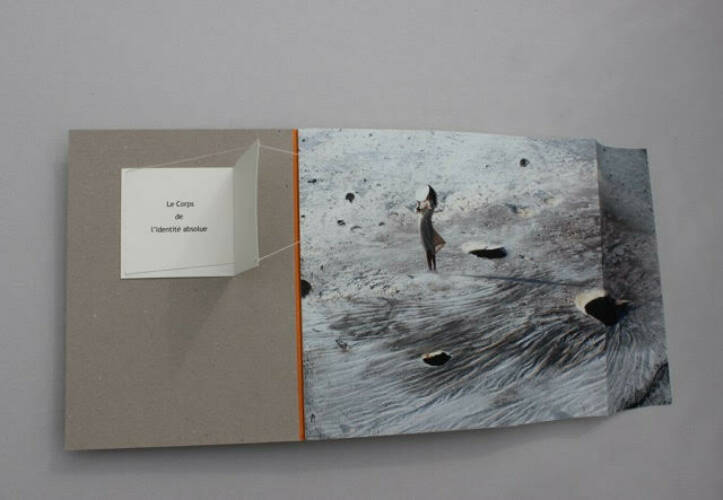 This book, born of Gabriela's discovery of a mystical poem in the work of of Michel Houellebecq's work, required 2 years of maturation, conception and and realization in order to achieve this material and spiritual material and spiritual. The mystery of the poem echoes the strangeness of of the times we live in. The result is that certain materials are brought together in an unusual way in a book. In an e-mail, Michel Houellebecq described "The Body of Absolute Identity" as an old file in the absolute identity" as an old case in the sense that the mystical quest at the heart of the of the poem has been open to him for a very long time. So we have used this remark to create the back used this remark to create the spine of the book so that it gives the impression of the impression of different coloured folders bound together by a strip of by a black velvet calfskin band.