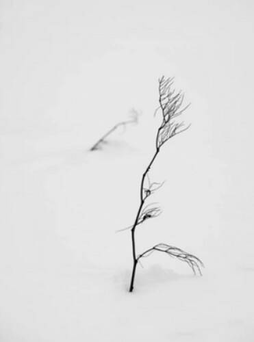 “When I walk on the fluffy virgin snow, in the distance I notice unusual forms. On closer examination they are only some weeds, with their stalks broken and leaves fallen, leaving only a skeletal form. Against the white snow these forms appear black and form sharp markings, as if drawn.