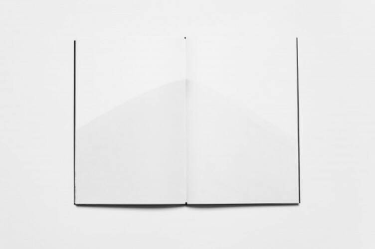 The volume unfolds as a circular paper dance between opposites continuously swapping the lead. The narrative starts with five completely blacked-out pages that progressively sublimate into an all-white double-spread sitting right in the middle of the volume: the peak of the day, the mountain top, the sharpest, protruding fore edge of the book.