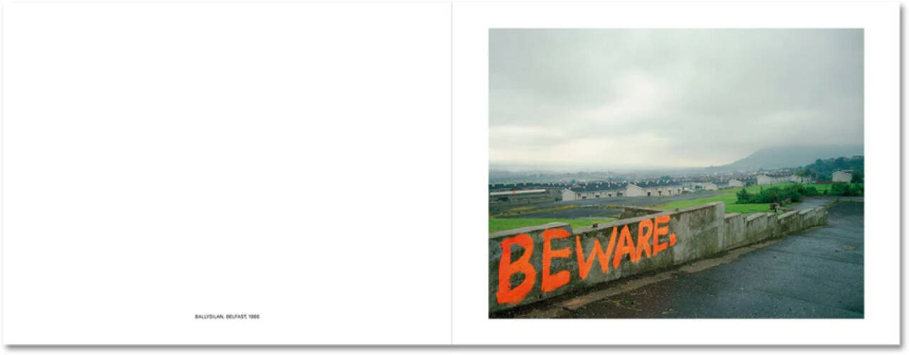 An iconic project made at the height of the ‘Troubles’, Troubled Land deals with the small but insistent signs of political division embedded in the landscape of Northern Ireland. At the heart of the Irish conflict lays the land — who owns it, who controls it, whose history it expresses. Paul Graham’s quietly radical book keeps this material truth in mind as it uniquely combines landscape and conflict photography, seducing us with bucolic views in which telling details only gradually appear: painted kerbs, distant soldiers or helicopters, flags and graffiti, paint-splattered roads, each tacitly aligning that location to its Republican or Loyalist allegiance. Pastoral photographs of green fields and hedgerows reveal themselves to be images of conflict and dispute — despite the steadiness of the photographic frame and the clarity of Graham’s vision, this is unsettled land. Originally published in 1986, Troubled Land is reprinted here for the first time in thirty-five years. Controversial then for its use of colour and refusal to follow the clichéd tropes of photojournalism, the book was pivotal in providing a fresh perspective on Northern Ireland’s ‘Troubles’ and left a lasting impact on landscape photography, suggesting how it might engage with politics and society rather than escape from them. Together with A1 – The Great North Road and Beyond Caring, it completes a new edition of the remarkable trilogy of books Graham made in 1980s UK.