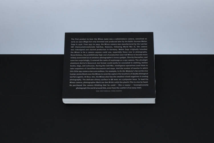 The first product to bear the Minox name was a subminiature camera, conceived as early as 1922 (Riga) but only invented and produced later by the Baltic German Walter Zapp in 1936. From 1937 to 1943, the Minox camera was manufactured by the Latvian VEF (Valstselektrotehniskā fabrika). However, following World War II, the camera was redesigned and started production in Germany. Walter Zapp originally intended the Minox to be a camera anyone could use, especially those new to photography. Nevertheless, the prohibitively high cost of production soon led Minox to become more widely associated as an amateur photographer’s luxury gadget. Shortly thereafter, and none too surprisingly, it entered the ranks of espionage as a spy camera. The ultralight aluminum device’s 80x27x16 mm format could easily be concealed in clothing, hollow books, bags, and suitcases. During the Cold War, intelligence operatives used them to take snapshots of classified documents and maps. And the number of movies in which this little spy camera stars are endless. For example, in On Her Majesty’s Secret Service (1969), James Bond uses the Minox to covertly capture the locations of deadly biological warfare agents. At 8×11 mm, the Minox also has the smallest-sized negatives in analog photography. The delicate silvery surface is 88 mm2 on a polyester base. To load his Minox camera, photographer Mark van den Brink (Netherlands, 1965) cut(s) the plastic film to size by hand. He purchased the camera thinking that he could – like a voyeur – inconspicuously photograph the world around him, even from the comfort of an easy chair.