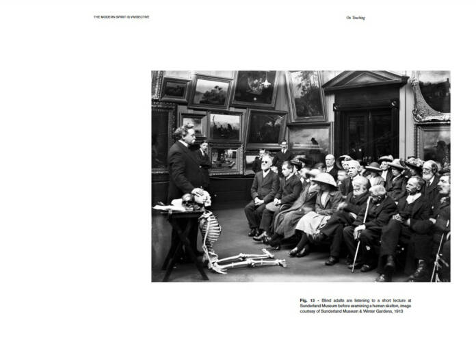 Presented as a cornucopia of materials, her found photographs of old Anatomy lab and blind school students mingle with appropriated frontispieces of Renaissance Anatomy manuals and her austere yet ironical photoworks to form a telescopic structure divided into overlapping sections – the chapters of her forthcoming book: on looking, on touching, on cutting and on discovering.