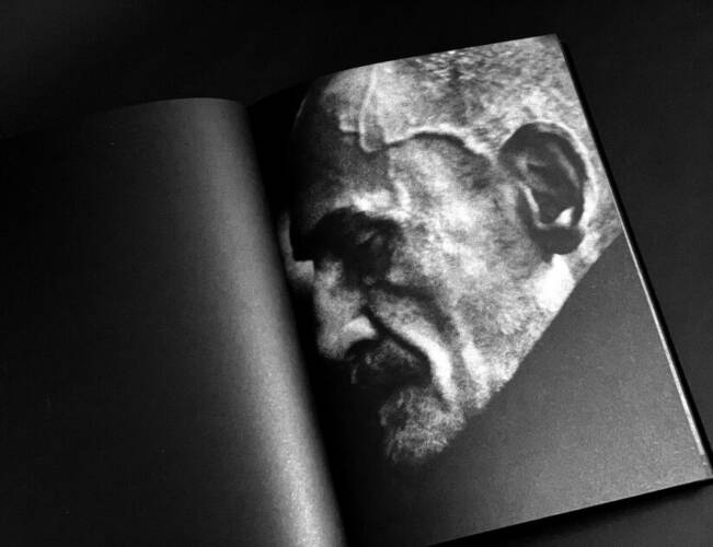 Comments: Hard velvet cover with embossed photo; Black book edges; Duotone printing (two blacks); Foil stamping on the spine; Size: 20 x 28 cm; Book in a three-quarter printed slipcase