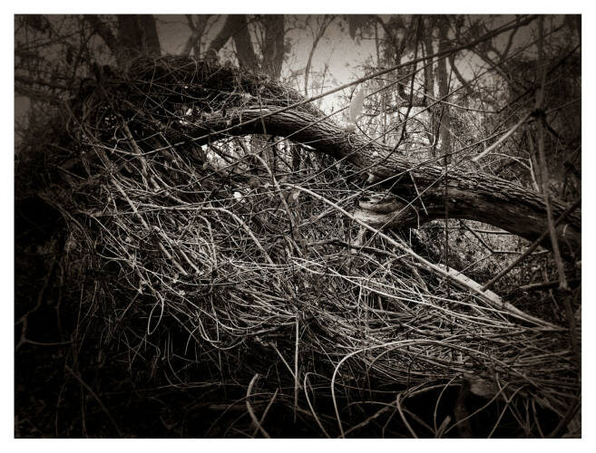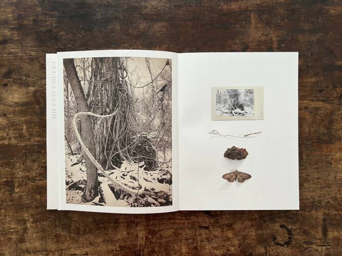 Roots & Waltz was inspired by a walk through the Vienna Danube riverlands. Regina Anzenberger went there with a friend during pandemic times, when everyone in Vienna was stuck indoors and going for walks outside. Having grown up in the countryside and having lived in Vienna for over 30 years, the artist noticed that her Viennese friends didn't actually leave the city when they longed for nature. Instead, they would go to the Prater-Auen, which is Vienna’s ‘Central Park’ and had served as the Emperor's hunting grounds over 100 years ago. The landscape, with its fascinating, wild natural forms, shares even more, leaving plenty of room for imagination. The artist conveys moods with her painted-over, drawn-on photographs, augmented with found objects. After the pandemic, the war in Ukraine began, and the whole world changed again. More questions arose regarding the essence of life, roots, and the future of the planet. The forest, as a source of creative inspiration and energy, became a refuge for many. Nature makes the soul dance, wandering through the floodplain forest, one could almost say, "dancing to the