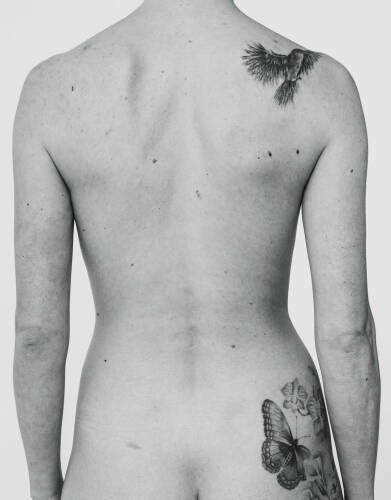 The work Ratio consists of 117 images featuring the same number of naked men and women photographed from behind. Bram Van Stappen made the series as part of the exhibition Back, organised in Antwerp, Belgium, in 2021. Over a period of six weeks, the photographer set up a field studio and invited visitors to undress and take place in front of the camera, yet face the opposite direction. Set in a generic surrounding and central composition, evenly lit and tightly cropped, the resultant black-and-white images display a form of (anti)portraiture that seems above all to be a study in paradox. For how do we read this collection of head- and legless torsos that do not even face us? How can bodies this naked and exposed appear so walled off and private? So unique and at the same time universal?