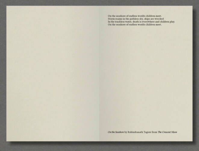 Comments: Saddle stitched softcover with uncut top edge. Size: 240x165mm (Portrait Orientation). Duotone PrintingNote: The catalogue is bound in an unusual way on purpose, both the top and outside edge is untrimmed. As a result this creates little pockets between each spread, this causes the paper to double up reducing show through, but creates a hidden page which is where the image captions are placed. So the viewer can know more about the images without having them disrupted by captions on the page.