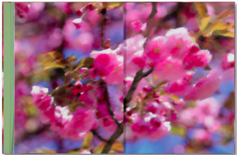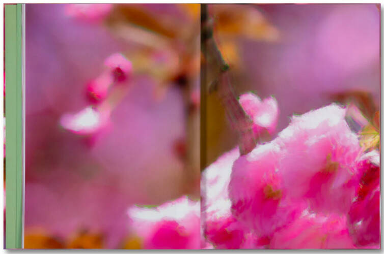 Graham takes these archetypal objects of natural beauty – and their observers – to form a layered examination of the ways we see and experience the beauty of the world. While the portraits of horizon-watchers are captured with golden-hour clarity, the interleaved images in each volume have been corrupted through the process of their creation. The blossom images in Verdigris are captured on a digital camera set to an ultra-resolution mode that uses multiple micro-shifted exposures. But disturbed by the gentle motion of a breeze, the camera struggles to assemble a coherent representation. Meanwhile the saturated sunsets of Ambergris result from a camera that is uniquely able to collect colour information at every pixel site, rather than approximate colour from nearby pixels. Pushed beyond its limits, the images become stained with artefacts of the overwhelming intensity of information.