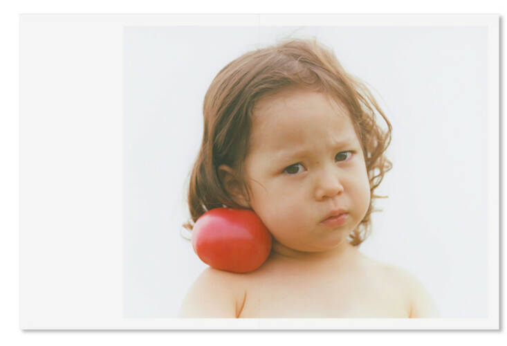A range of expressions and emotions permeate the pages as you gradually enter Osamu Yokonami's (b. 1967, Japanese) continuing exploration of primal instincts. The children glance at you. They unknowingly confront you with their personalities that subtly emanate faced with the challenge of holding onto a fruit or vegetable balancing between chin and shoulder — themselves placed within the ever transitioning clouds.