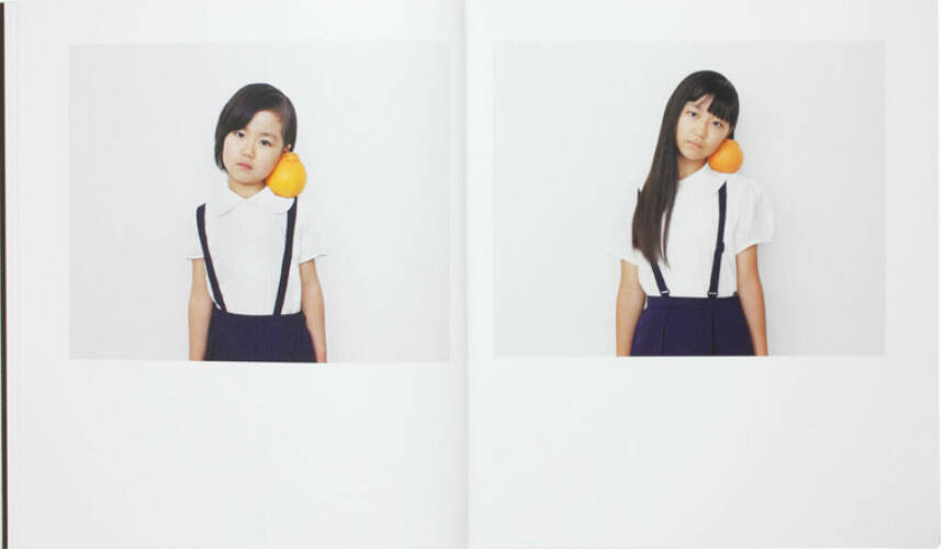 For “After Children,” Yokonami asked a number of his subjects, now junior high-school students, to restage the photographs of their childhood. Dressed in the same outfit, their hair and the fruit matching the photographs taken years before, the girls pose once again for the camera. In the photobook, each person’s photographs are juxtaposed, leading the viewer to observe, compare, and imagine.