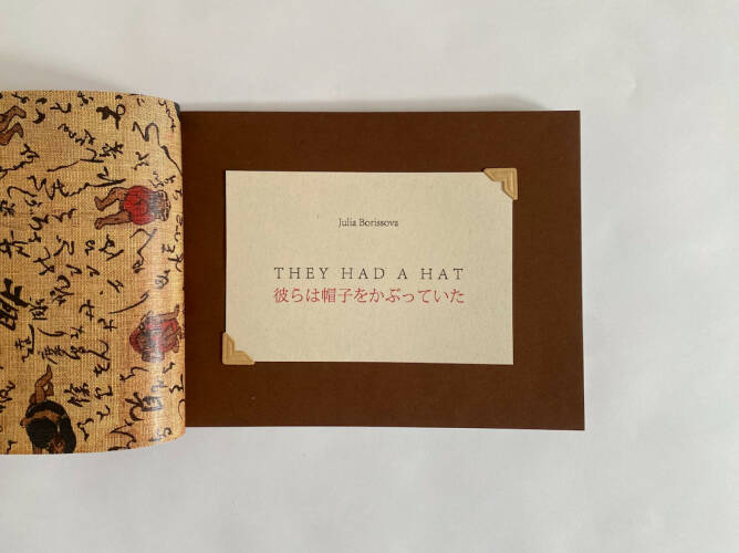 This book was created with material collected from Borissova's exhibition "Wrapped up in Books" at IACK, Kanazawa, Japan (30 July - 14 August 2022, where she installed a hat box with prints for swap. "They had a Hat" is a continuation of her book "He Had a Hat".