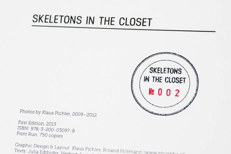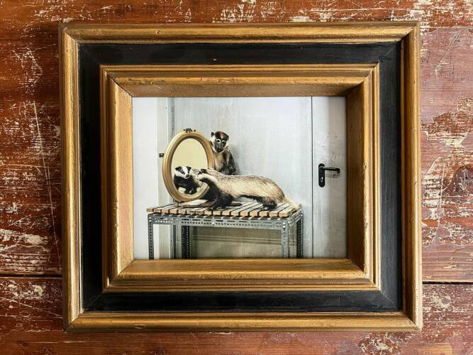 Comments: 21x21cm, hardbound, limited to 50 copies, signed and numbered book 'Skeletons in the Closet' with print 'Monkey, Badger, Mirror', 20x25cm (printed on Hahnemühle Fine Art Ultra Smooth Photo Rag, signed. Frame size: 38 x 33 x 6