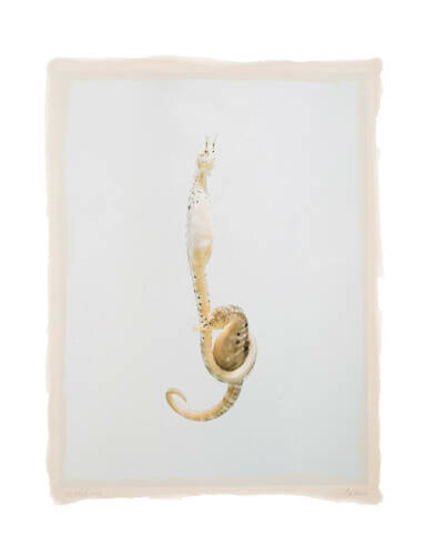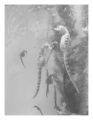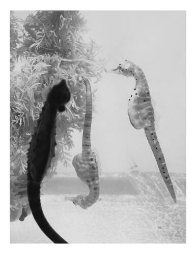 'It wasn't until I looked through the pictures a second time that they became my muses. Because I hadn't noticed the concentrated look that they direct at the viewer outside the aquarium at first. Dismissed as a tourist attraction, I put the work aside. But it didn't take long for their connections to each other in the density of the aquarium to inspire and capture me in such a way that I developed a growing relationship with them. Finally, I read two books about seahorses and found the author Andrea Grill, who I asked to write more about these extraordinary creatures.' says Regina Anzenberger.