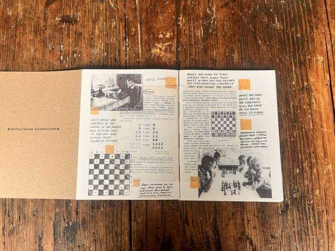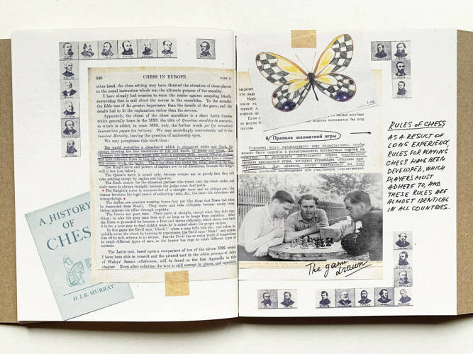 Ordeal by Chess - A mock chess textbook, featuring spreads from my sketchbook containing pages from the actual textbook, which I have supplemented with archival photographs and quotes. Julia Borissova