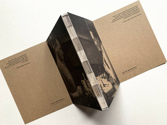 Comments: Size of the book when closed: 145x190 mm Paper: Remake Eko 120 Cover: EcoLine Brown 290 The cover has flaps and can be opened in both directions Printing: Inkjet Binding: invented by me specifically for this book Edition: 64 copies + 16 copies - a special edition that will be released when all three parts of the project are ready. regular edition, signed + print