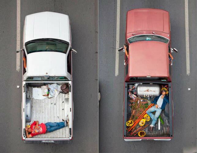 "Car Poolers is a project that continues my visual research on how the Mexican suburbs impact the landscape, the city and its inhabitants. I´ve been shooting the project for a year on Monterey's highway 85 going south bound to one of the richest cities in Latin America, San Pedro Garza Garcia, one of the nine cities that form the Metropolitan area. I shoot from a pedestrian overpass that looks over the cars coming out of a small tunnel and "predict" which trucks might have people in the back. These images present a not-so-subtle observation of overgrowth issues in Mexico; where suburbs are being built in far away lands, far from the urban centers, causing greater commutes and consumption of gas."
