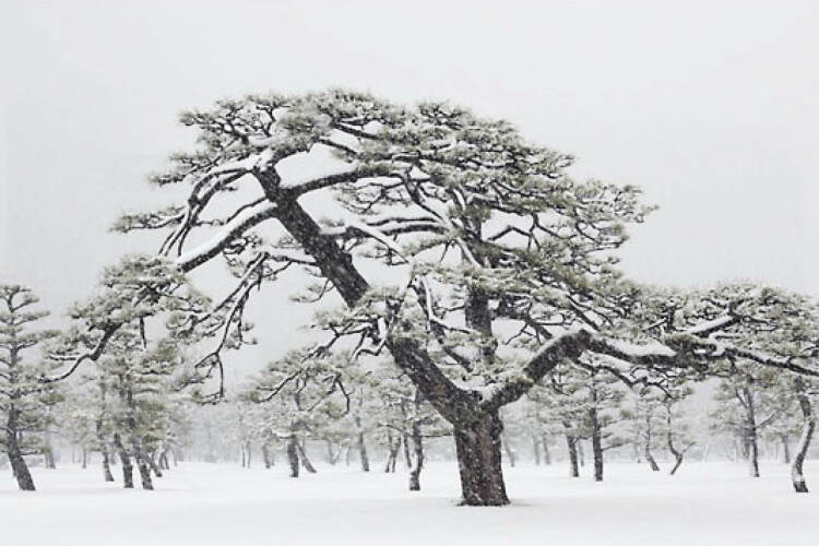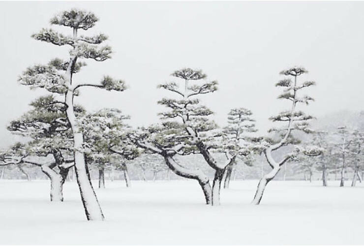 Jens Liebchen has taken the pictures in the outer part of the Imperial Palace Garden in central Tokyo. Here and there in the dense snowstorm we see cars bowl along in the background and isolated shadowy towering skyscraper silhouettes, that darken the sky. And for the trees, nature has supplied only the material. Placement, growth, size and shape are defined by people and planned down to the smallest detail. With his photographs Jens Liebchen, who lived in Tokyo for three years, reflects firm principles of the Japanese social system.