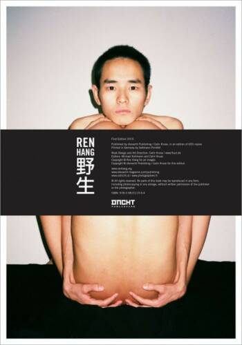 野生 is a large format collection of unbound posters (book size: posters folded to 28 x 40 cm, open size 56 x 40 cm) printed on strong paper, held together by a banderole. The double pages confront vertical formats with half of horizontal formats, vertical confront vertical, or half of horizontal confront another half or horizontal formats, recontextualizing Ren Hang’s work.It is Ren Hang’s biggest and heaviest book up to now.