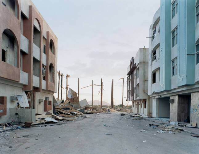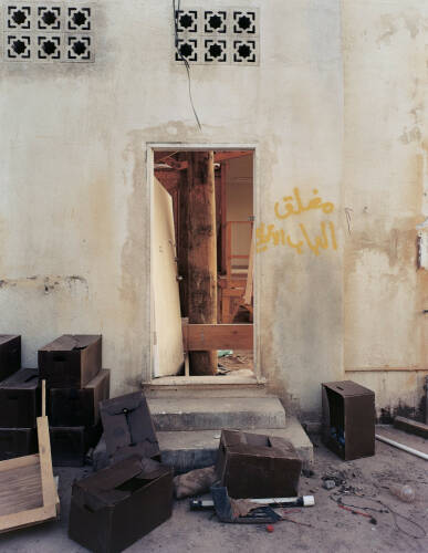 The definitions of place and time become diffused in a tightly edited selection of 8 large-format images depicting what we have come to recognize as a war-torn Iraq. The irritation begins when we realize that this Baghdad is possibly not in the middle east, but maybe, just maybe, east of Phoenix, Arizona.