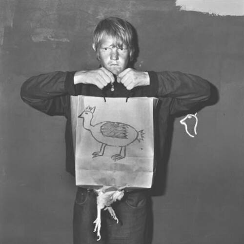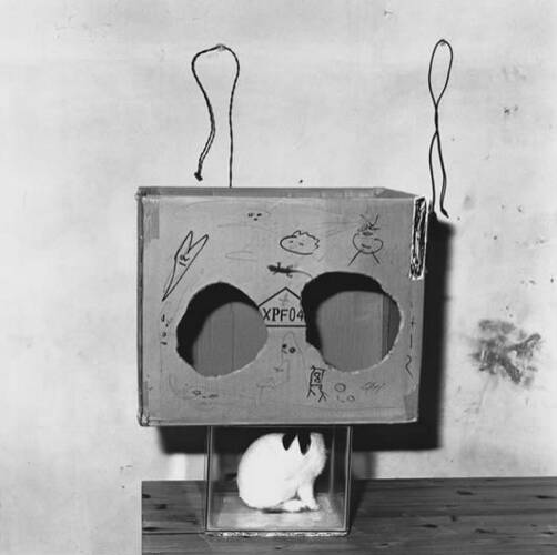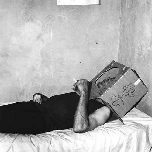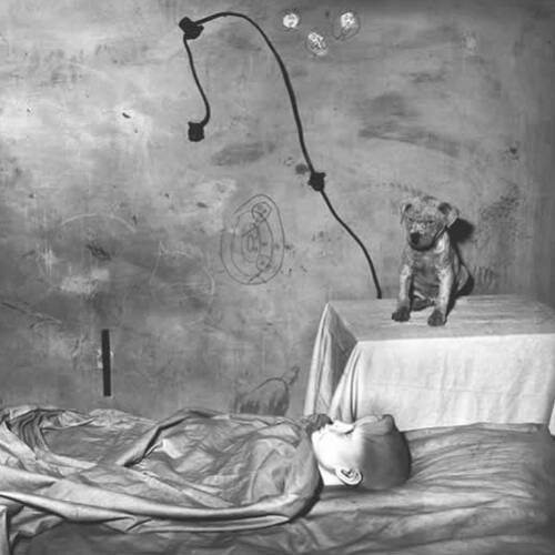 The results are completely abstract and not defined by the origins or specific location of the characters he photographs. Ballen focuses on the interactions between the people, animals and objects that inhabit mysterious rooms – the shadow chamber. The rooms are unsettling and strange: their walls are covered with scribbled drawings, stains and dangling wires, the floors are strewn with bizarre props and artefacts. Dogs, rabbits and kittens wander into the frame or are stuffed into unlikely containers. Figures hide away in boxes, crouch behind overstuffed sofas and squat with their shirts pulled over their heads.