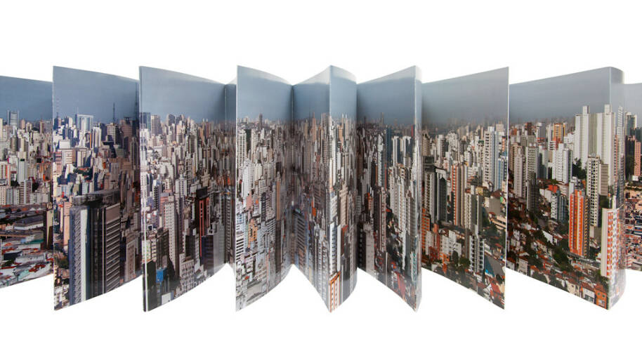 Sobre São Paulo was produced between 2011 and 2012. It took four helicopter rides and ten outings to rooftops, among them the traditional Fiesp and Martinelli buildings and the new Santander tower. “I am not a documentarian, my approach is artistic and I wanted to produce work that would showcase the difficulty in visualizing the spatial dimension of the city. São Paulo is exorbitant in size, frontiers are lost, and photographing from the pedestrian’s point of view makes no sense. For this reason I opted for a point of view which is frontal, aerial and distant. I carried out montages and combinations of the photographic material, creating panoramic images that extend as though unrolling a tangled ball of city. This led to the idea of making a book with accordion folds. The mapping is subjective; what I want to transmit is the sensation of immensity and complexity of this city,” explains Claudia.