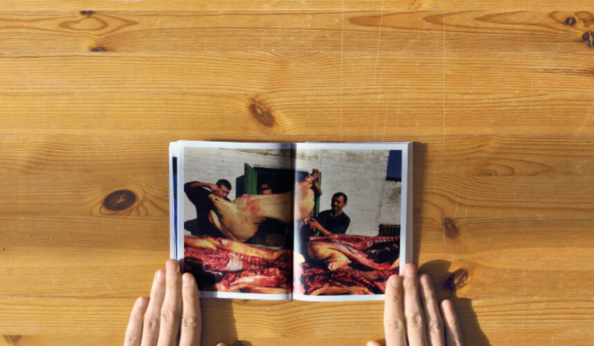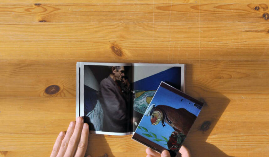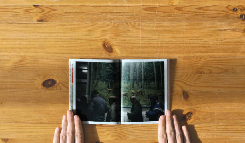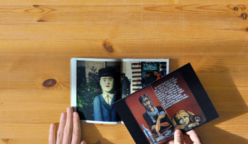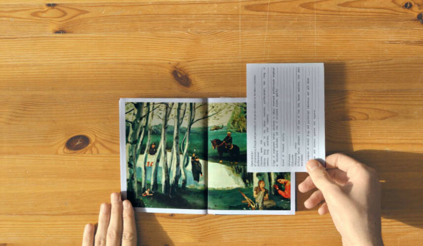 It is a book about alcoholism. Most of us drink regularly, without any acknowledgement of our little habit as an addiction. This book will transport you to the bottom of this issue – to a strange place called the Labour Treatment Profilactorium for the Alcohol and Drug addicted. Before you can begin you must open a real metal cage, with the risk that you might damage yourself. Once inside you can open the tattooed skin of the front cover and begin your journey! The book is a surreal voyage, taking you through a closed space filled with artistic Soviet propaganda while also witnessing the occupants with their lost faces. You will read their postcards of postmodernist monologues and insane collages and get a taste of the endless set of rules that govern this place (including all the details of how to dispose of your body should the worst happen). Before you can leave the nightmare behind you must fill in the release form, where you will need to describe your own behaviour. And finally your journey is complete.