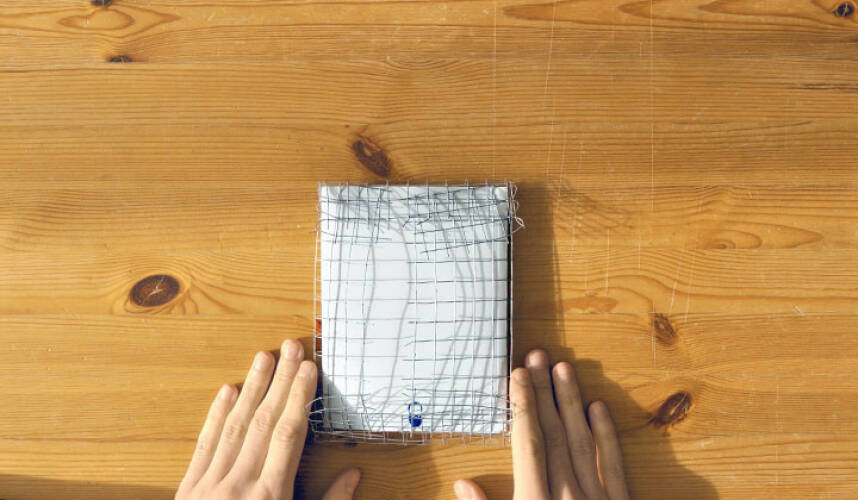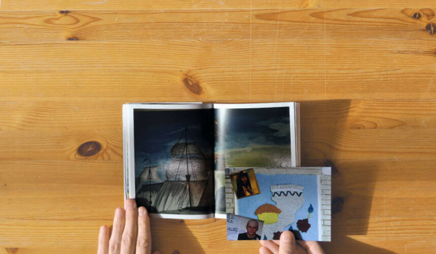 Comments: Softcover, packed in metal net, limited edition of 500, 4 loose postcards and 5 loose documents attached, each book has an individual intervention, 12 x 16 cm