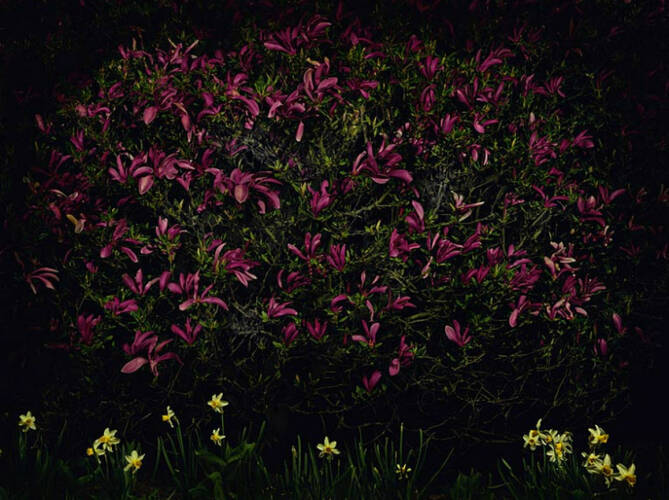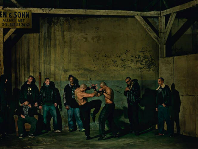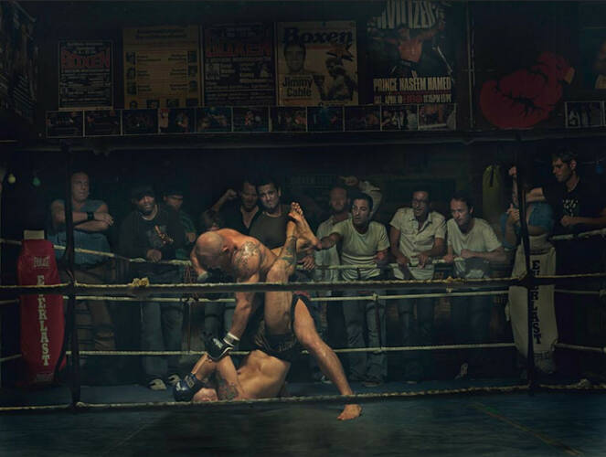 Free Fights, in cages or on the street, show martial gestures, wild young men, a scene focused on itself, secluded from the public. Castell approaches his male protagonists just as he does his plants – at night, with a strange, preternatural light enveloping both settings. Delicate still lifes confront fight scenes with the feel of old-fashioned panel paintings. Castell stages, directs, arranges – he is one of those he depicts, fighting alongside them for several years now; he knows what it’s all about. The viewers, too, become part of his compositions; like a theater director he creates scenes brimming with intensity and emotional weight.