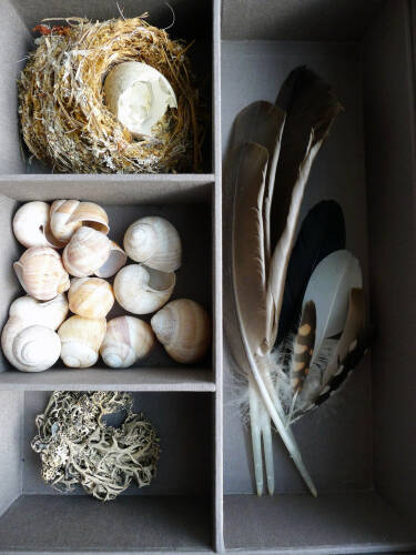 Comments: unique collector's edition. linnen box in the size of 34 x 26 cm, includes the book 'Roots & Bonds' no. 250, an original painted print in the size 30 x 24 cm and found objects (feathers, snail shells, moss and a bird's nest with egg).