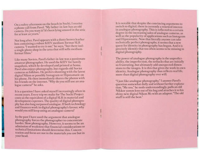 Sketchbook Series # 03 -The Sochi Project’s third Sketchbook depicts Sochi in the summer as well as being an ode to analogue photography. In the summer of 2011, Rob fell in love with a 40-year-old KIEV medium-format camera, which a friend gave him as a gift in the Russian resort of Sochi. Over the following days, he roamed the city with his new acquisition and photographed things that he had never seen before through the lens of his Mamiya camera. When he got home and developed the films, he found that the KIEV’s film transport system was defective.