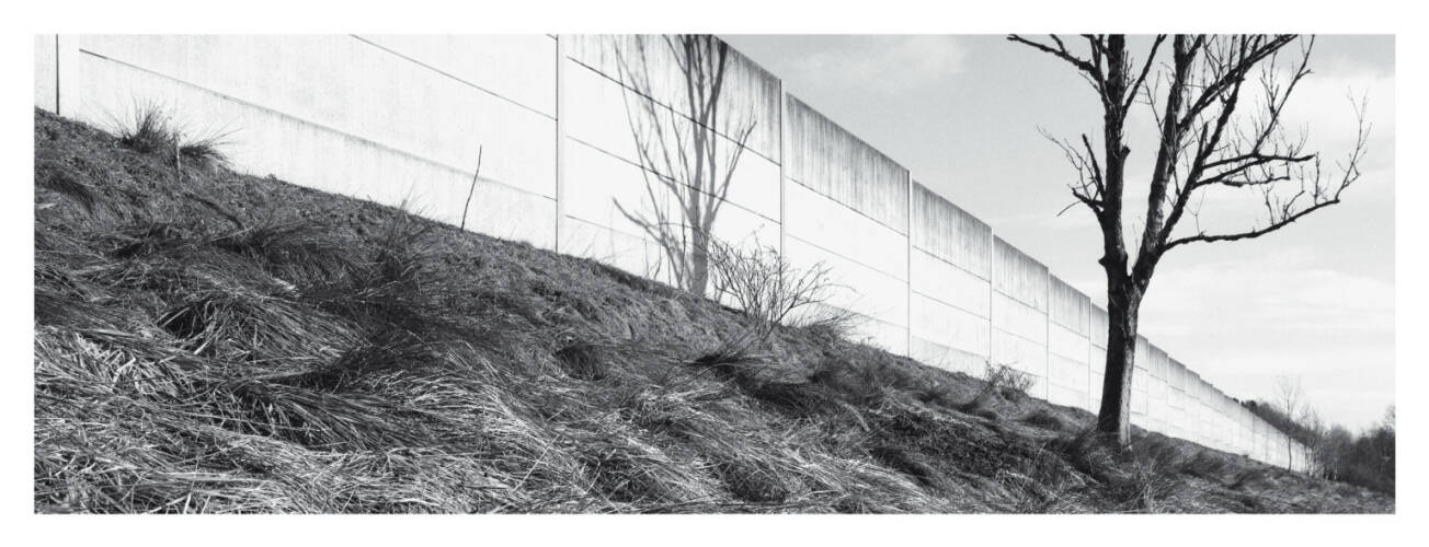 A book about infrastructure. A book about configured landscape, A book about walls and what they do to us. Thomas Bundschuh has been travelling along the Austrian highways for weeks – mind you, on the outside – and has captured noise protection walls. How they shape the landscape, how they cut through the scenery and how they become self-drawn borders that narrow our horizon.