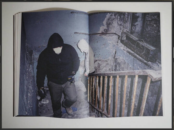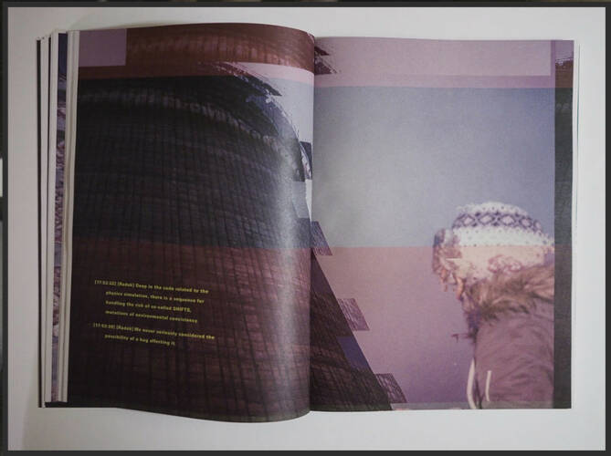 Deliberately referencing classic works of fiction such as "Roadside Picnic" by the Strugatsky brothers and Tarkovsky’s “Stalker”, as well as inspired by J. G. Ballard’s novel "The Crystal World", "The Sentinel Script" plunges the reader into a multilayered narrative wormhole: while the images describe the activity of the visitors inside the elusive Zone, texts emerge like disruptive transmissions from another dimension, interfering with the visual sequence and its reading.
