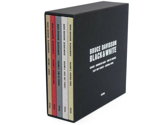 Black & White is the definitive collection of Bruce Davidson’s black and white photography, spanning a period of 40 years. This collectable five-volume set comprises re-prints of classic books of Davidson’s poignant and purposeful imagery, some of them newly edited and expanded. The seminal bodies of work are Circus (1958), an intimate portrait of a dwarf clown; Brooklyn Gang (1959), depicting a group of troubled youths; Time of Change (1961–1965), a civil rights documentation in America; East 100th Street (1966–1968), showing life on one block in Spanish Harlem; and Central Park (1992– 1995), exploring layers of life in New York’s famous urban oasis. Black & White is a tribute to Davidson’s unique photographic achievement, and a powerful document of social change.”