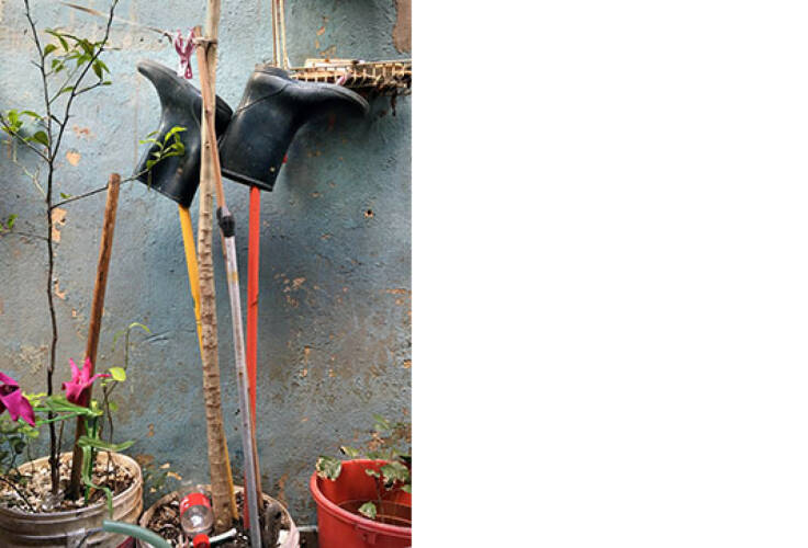 And so it is with the rubber boots and other footwear. Not the shoes themselves are specific, but rather how they hang on hangers or next to fishes on the clothesline, are parked on pipes, walls, window sills or slipped on broomsticks and chair legs. This book is big fun again, and at the end rats flit around our feet.