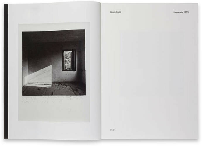 Preganziol, 1983 is, at first glance, a simple exploration of light, a photographer’s exercise in how to define and describe physical space within a photograph and how light shapes these descriptions. On closer inspection the series is multi-layered: Guidi’s portraits of a room alludes to the idea of the camera obscura; exterior vistas allude to the Albertian window; blank walls create an aura of emptiness and abandonment; and the shifting of light across the walls signifies the movement of time.
