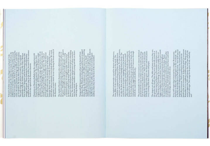 Sochi attracts mainly Russian tourists in the summer. On the one hand, they come looking for glitter and glamour and are prepared to pay for it; on the other, they attach great importance to Russian culture and traditions. The ultimate example of this can be found in Sochi’s nightlife. Many restaurants try to attract customers with flashing neon signs, semi-luxurious interiors and an abundance of staff. At the same time, every restaurant upholds a well-known Russian tradition of live musicians who belt out Russian chansons from behind an electric piano. The book ‘Sochi Singers’ explores how a deeply rooted Russian tradition goes hand in hand with the city’s new capitalist glamour.