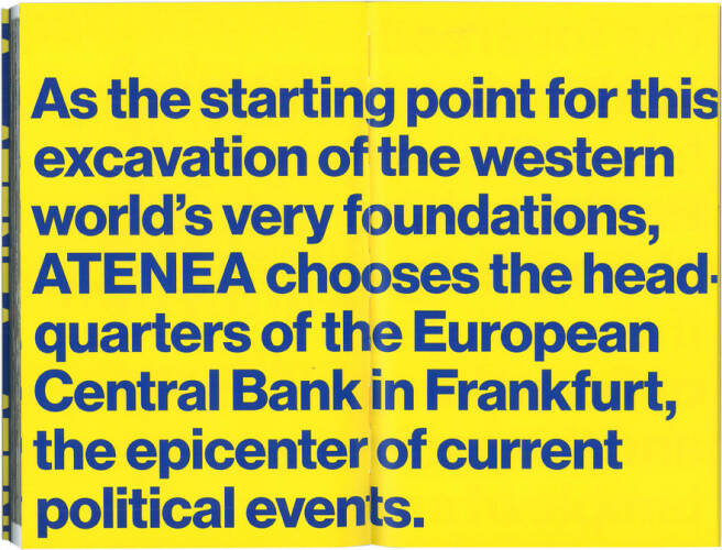 ATENEA is a journey both physical and symbolic, across a Europe marked by depression and disillusionment. Far away from the hungry gaze of the media I try to offer a vision of a mysterious and unsettling continent, scattered with scenes in which animate and inanimate being converse in an encrypted language. On a sort of situationalist derive, I crossed about forty cities as an observer like a flâneur, a true homo ludens, taking delight in the extraordinary among the visible signs I encounter, transforming the ephemeral path traced across the map into a board game of my own invention. As the starting point for this excavation of the western world’s very foundations, ATENEA chooses the headquarters of the European Central Bank Frankfurt, the epicenter of current political events. The tour reaches its culmination two months later, at the feet of the Parthenon in Athens, thus closing the gap between the modern-day “temple” of financial speculation and the ancient greek temple of art and wisdom. It is a journey from north to south, from Europe the affluent to Europe the impoverished from the contemporary crisis of values to the original value of ideas.